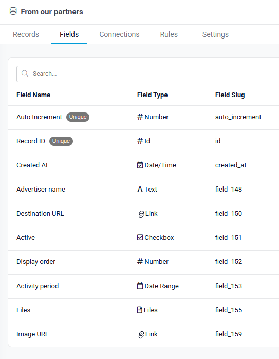 I have a sidebar showing ads. ideally just the ads on a light background, rounded corners, with a light shadow, and linking to their own websites. I’d like to keep the ads in my own database, without requiring external storage. So I have a data table to do this, with fields as shown in the screenshot: