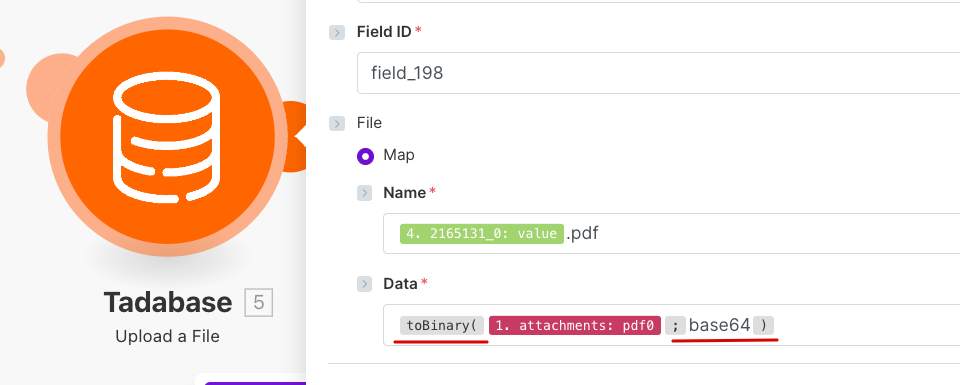 Tadabase (Upload a File): The final step, configured to upload the PDF.