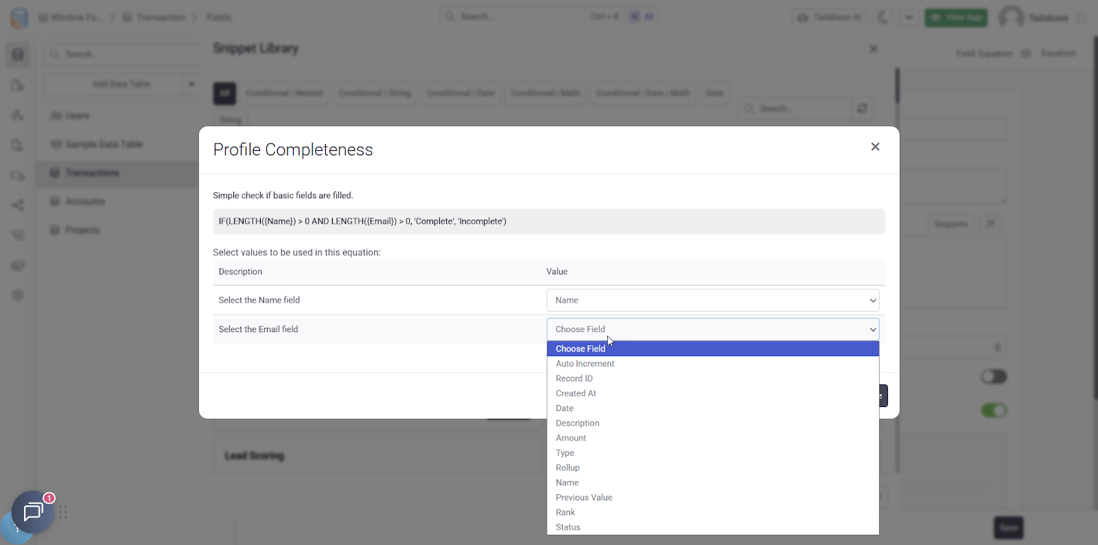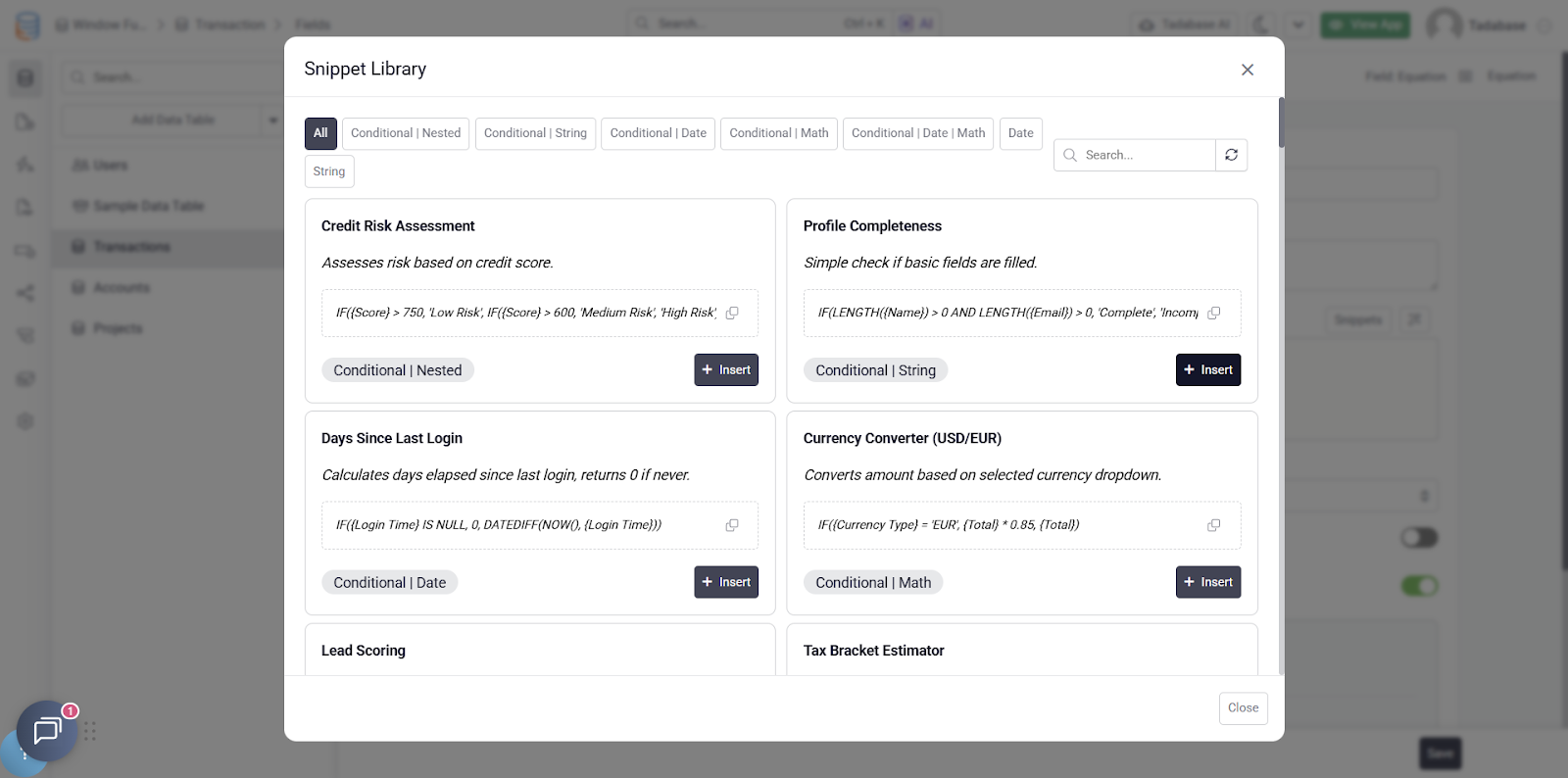 When inserting a snippet, you can easily update the dynamic values with fields from your database, making it incredibly fast to implement even the most advanced formulas.