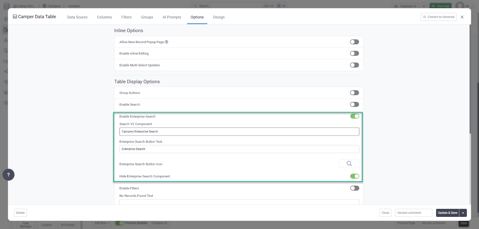 You can now enable Enterprise Search directly within supported components. When enabled, a dedicated search button will appear, opening the advanced Enterprise Search in a popup for a more powerful and flexible filtering experience.