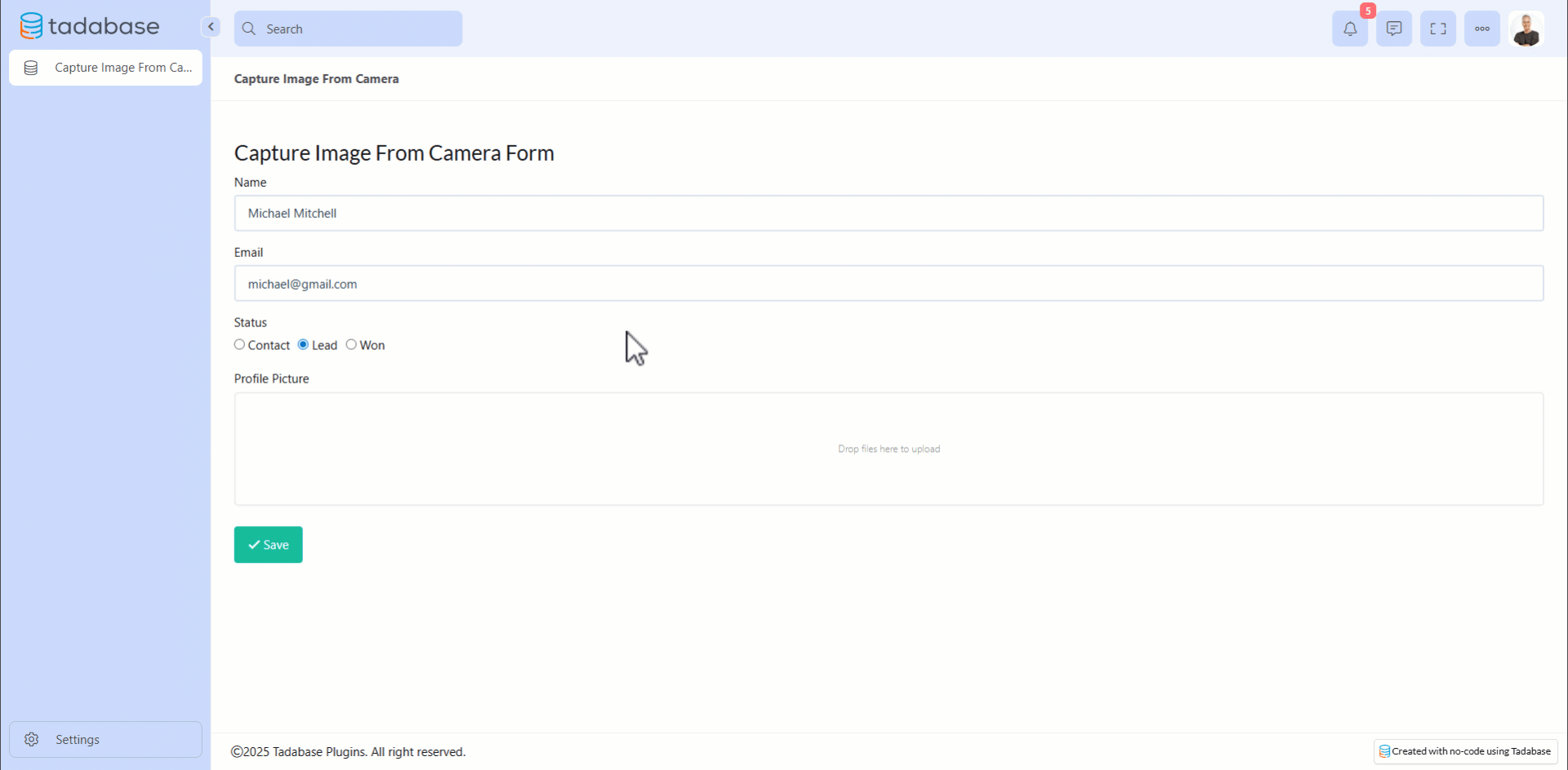 This plugin adds native camera functionality directly into any Tadabase Attachment field.
