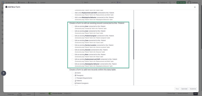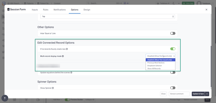 When connected records include multiple records or none at all, you will have additional options. If no connected record exists, you can create a new record directly from the page. If multiple connected records exist, you will be able to paginate through them and edit each one individually.