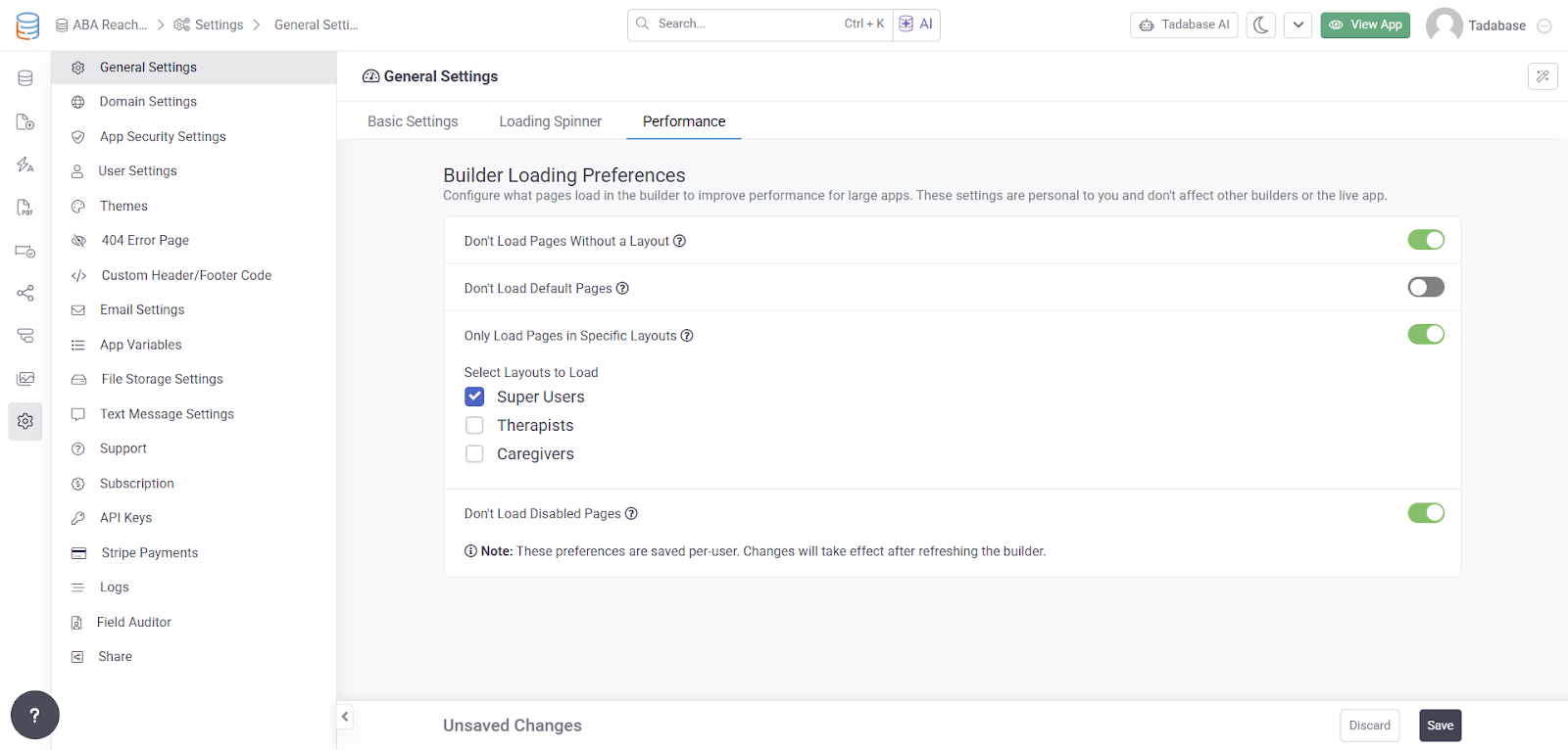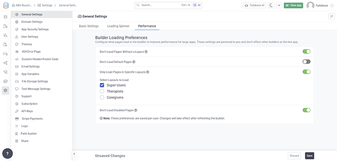 You can now disable certain layouts and nested pages from loading in the Builder, which is especially helpful when you are working on a specific layout and only need those parts of the app to load in real time.